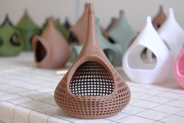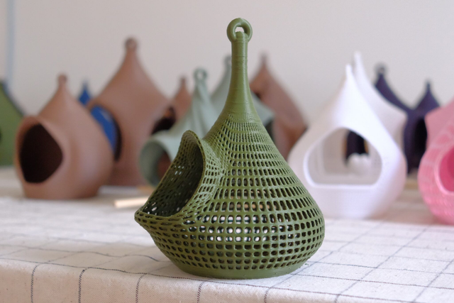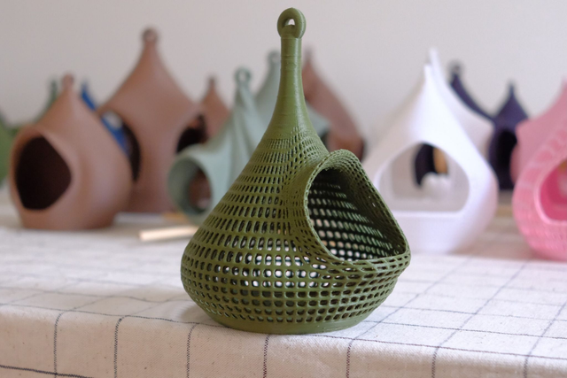 La mangeoire Sabine Maillage a 1 entrée et une structure en maille. Les dimensions sont 11cmx12cmxh15cm. Existe en plusieurs colories. Fabrication artisanale par la Maison Le Du, réalisée à l’unité en impression 3D avec un filament biosourcé. Ce modèle existe en plusieurs déclinaisons.